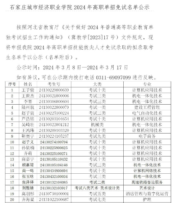 石家莊城市經(jīng)濟職業(yè)學(xué)院2024年高職單招免試名單公示